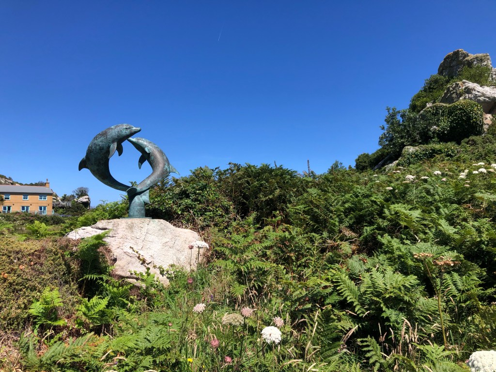 We took are few pictures of the cottages as we strolled along a lane that looked as though it belonged on a Quality Street tin. The pub garden had some tables and chairs made to look like crab claws which were fun for kiddies to sit on, if there were any, and also a sculpture of dolphins set against a rugged cliff face which was pretty impressive.