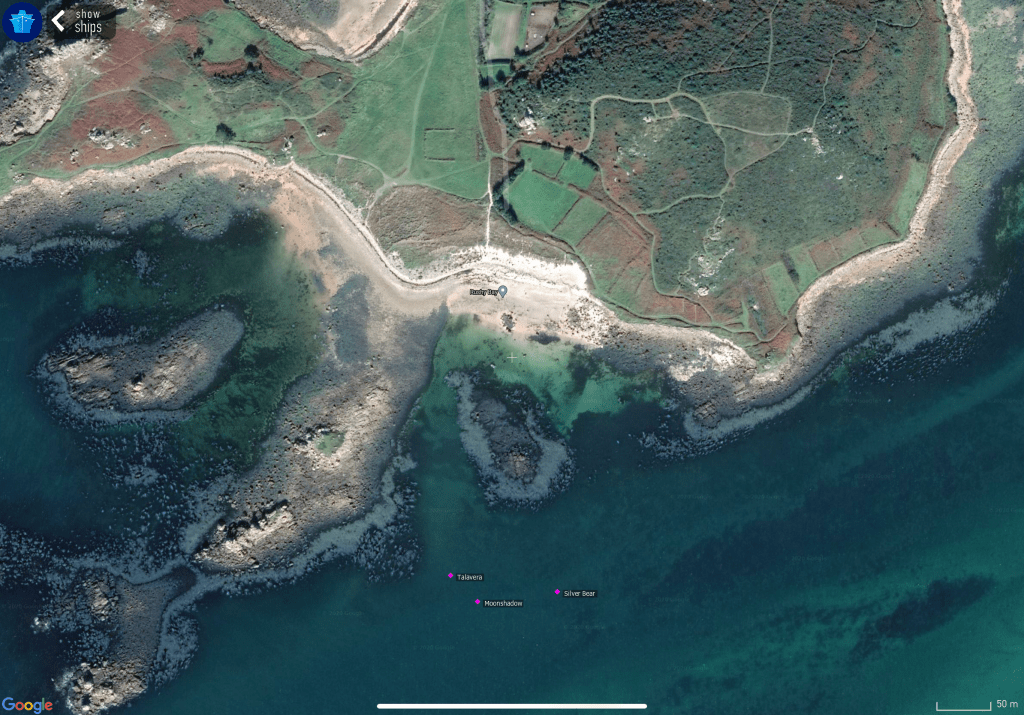 The three ASA yachts anchored in Rushy Bay on the south side of Bryher