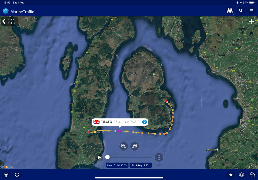 A helicopter took off from a war ship as it approached Davaad and we approached Pladda, which made a change from watching seagulls. This was shortly followed by ‘Sea Wolf’, a magnificent 58m x 11m privately owned pleasure craft, just a trifle grand, registered in the Marshal Islands (Pacific) don’t you know.
