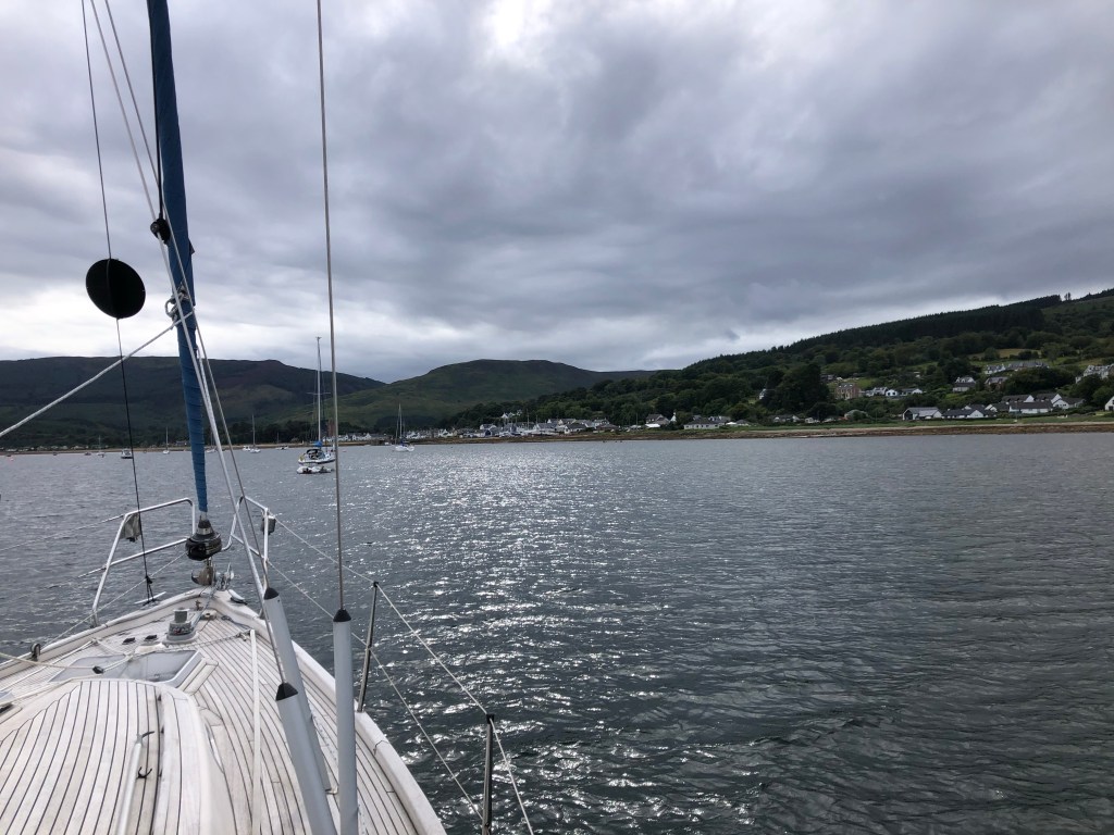 We are now at anchor at Lamlash (Arran). To our NW is the small town of Lamlash, to the south is forestry, farmland and a fishery and to the east is Holy Island. There are 6 boats on mooring buoys and 3 at anchor, it’s very quiet with Goat Fell in the background, a magnificent 874m (2,867ft) mountain in the background.