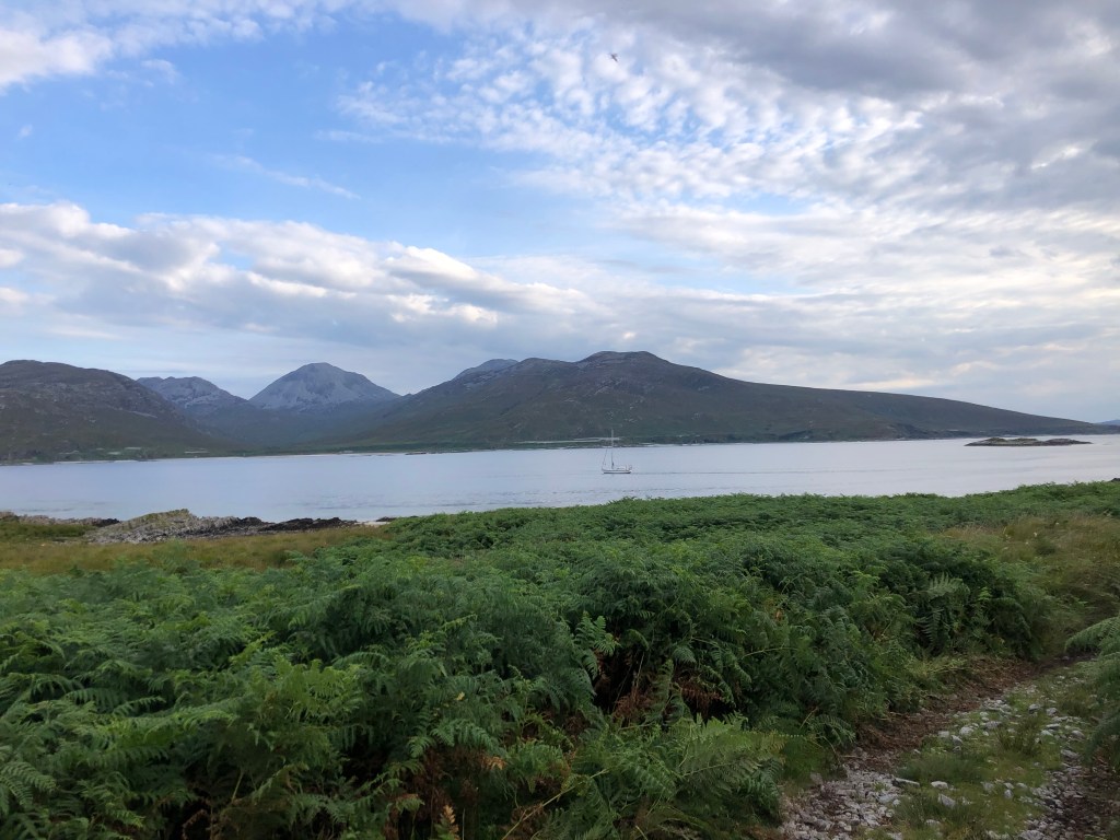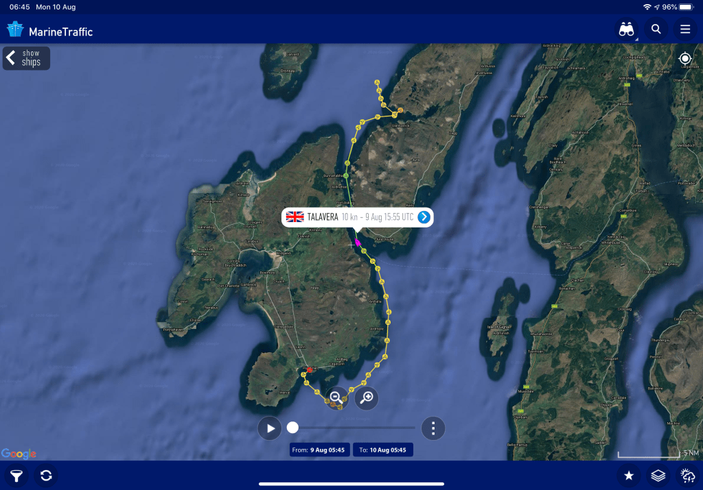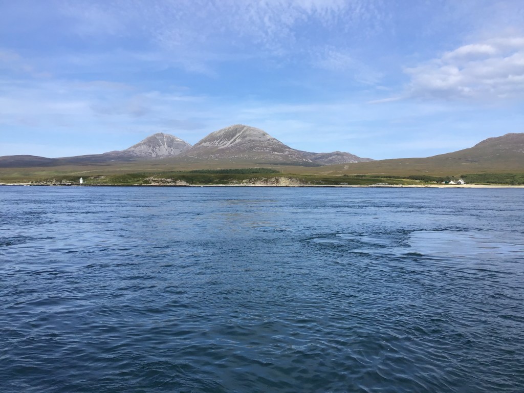 The passage took us into a channel between Islay and Jura passing by Glas Bheinn standing at an impressive 562m 1844ft. Talavera reached 11.6 kts SOG and we could hear the water literally fizzing, the sea state was very disturbed. All along the shorelines of both islands were secluded beaches with not a soul on them.