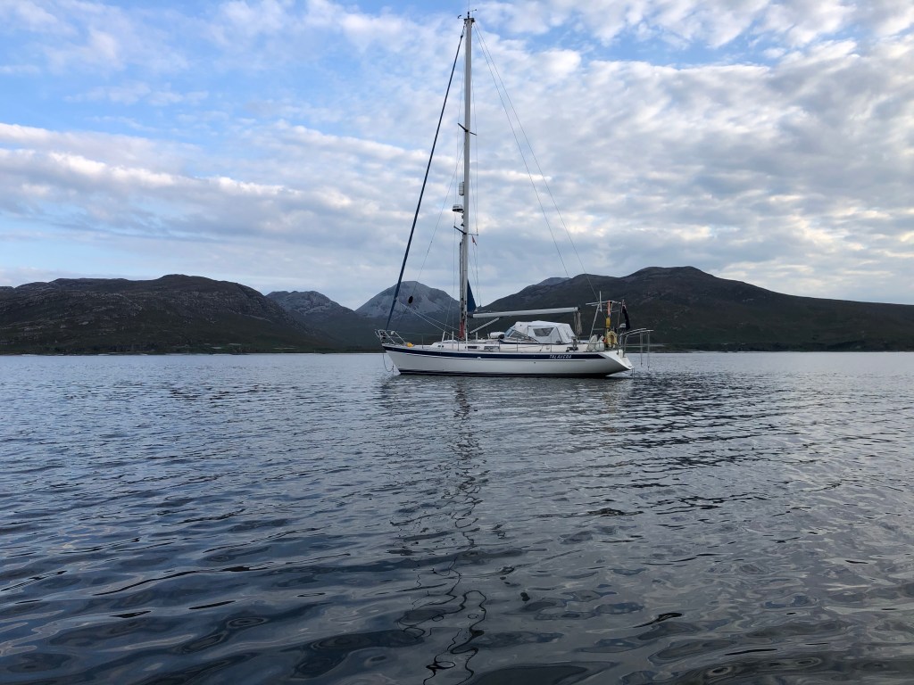 Having spent so many days surrounded by mountains we had expected to have spotted a sea eagle, but hadn’t as yet. However, we arrived at the anchorage in Loch Tarbert with much excitement because there sitting proudly on the edge of a cliff was a Golden Eagle!