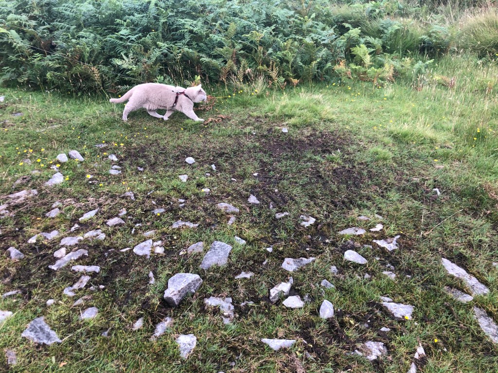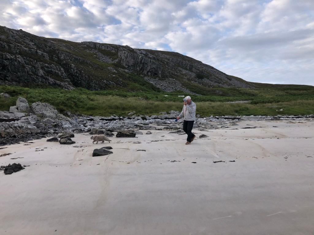 What looked like grass gave way to peat bog and the bracken just came alive with all sorts of biting insects which we didn’t hang around to identify. With arms flailing in an attempt to fight the blighters off, and both of us giggling like school kids, we legged it back to the sand. We grabbed Artie, chucked him into the dinghy and started rowing like crazy as he calmly licked his paws, nothing having penetrated his dense fur, lucky him.