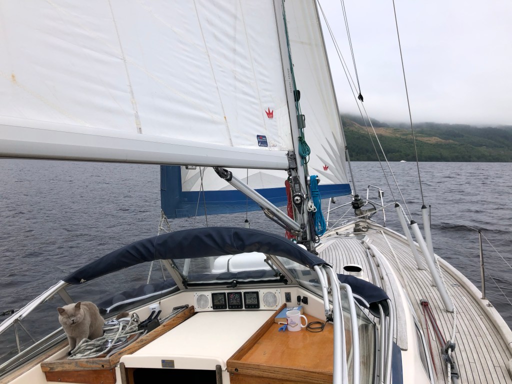 On a huge plus side we had brilliant sailing conditions to keep us busy. We didn’t use the engine at all in the loch and tacked from one end of Loch Ness to the other. We had a look at our track and reckon we put in 30 tacks. It was a really great afternoon, the sun shone and there was very little boat traffic about, only a small ferry which we saw several times going back and forth and a rib doing the same with day trippers but the rib was considerably quicker.